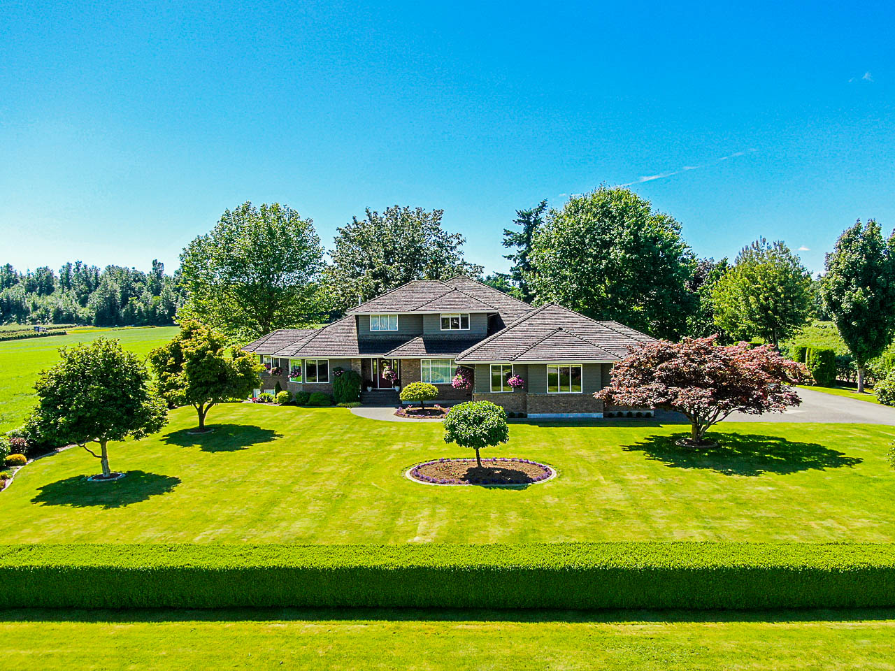 Fantastic opportunity for family farm living in prime location! Flat and usable 19 acres featuring a grand 5,981 sqft home with 4 bedrooms and 6 bathrooms. Huge country kitchen with cozy nook and door leading to 33′ x 23’5 partially covered sundeck; perfect for relaxing or entertaining! Primary bedroom (with walk-in closet and ensuite) and laundry on the main along with spacious living and family rooms. 3 bedrooms and 2 bathrooms up. Great space for entertaining below with large games & rec rooms, flex, storage, and bathroom. Large garage with in-floor heat! Easy maintenance for landscaping with inground irrigation and watering system in place for gardens. The property is serviced with domestic and irrigation wells; the land is tile-drained with fertile soil suitable for a variety of crops. Large barn measuring 40’ x 100’ with 21’4 x 47’9 cooler and additional lean-tos. Magnificent Mount Baker and pastoral views surround this picturesque property!